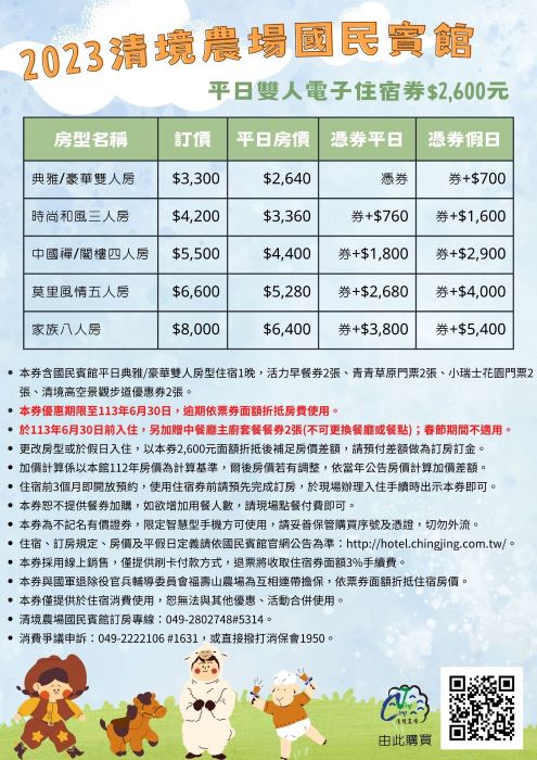 1.本券含國民賓館平日典雅/豪華雙人房型住宿1晚,雙人活力早餐券、青青草原門票及小瑞士花園門票